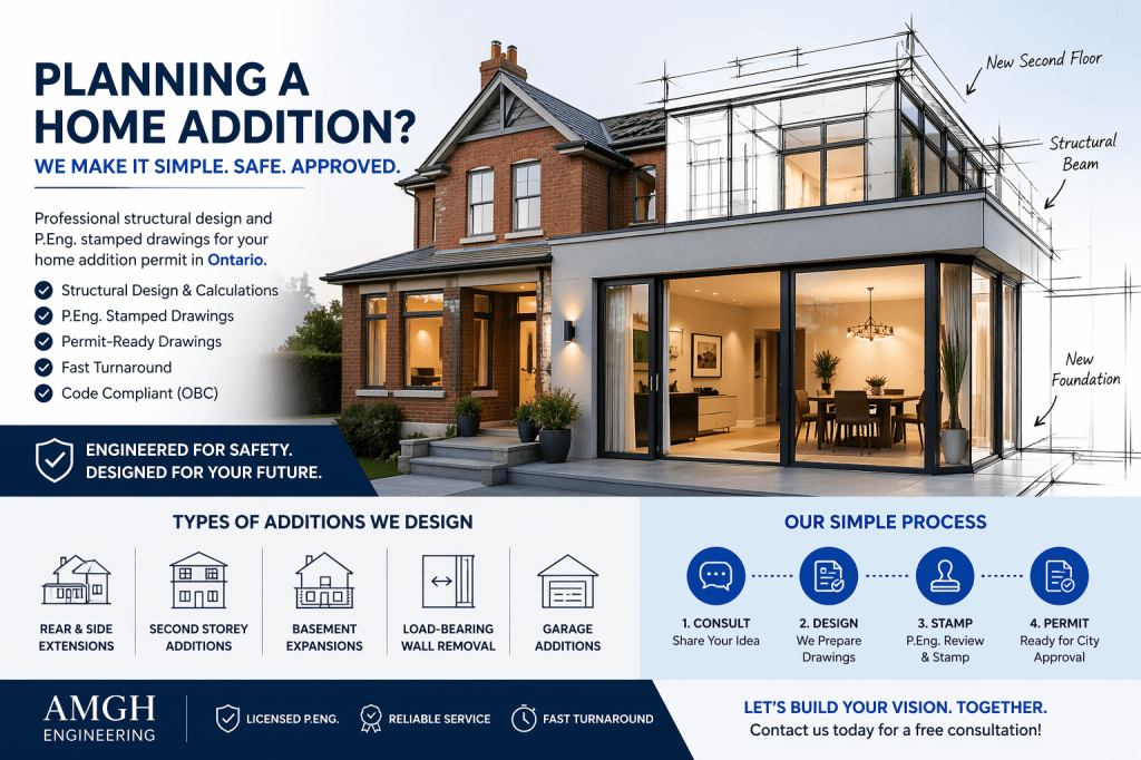At AMGH ENGINEERING, we provide structural engineering for home additions, including P.Eng. stamped drawings required for permit approval.