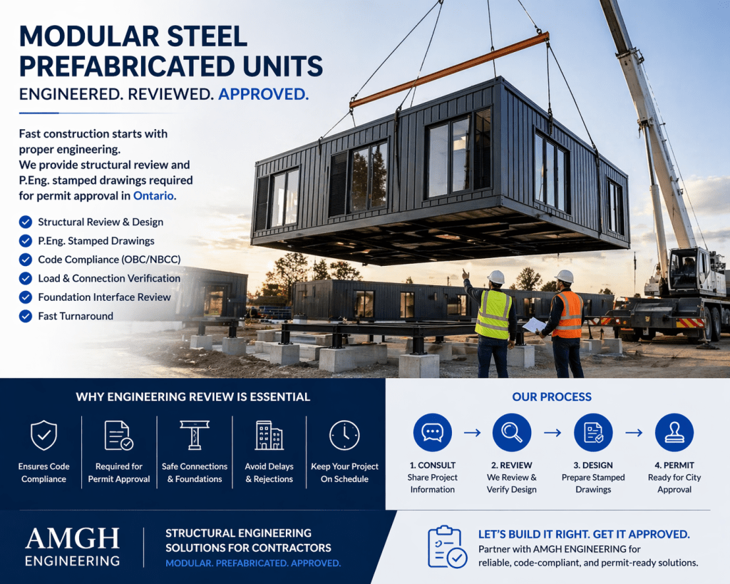 At AMGH ENGINEERING, we support contractors with structural review and P.Eng. stamped drawings required for modular and prefabricated steel systems to meet permit requirements in Ontario.